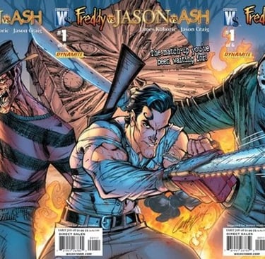 Se nos cinemas era difícil fazer crossovers, nos quadrinhos, Jason passou por tudo e mais um pouco. Em uma continuação direta de Freddy vs Jason, temos Freddy vs Jason vs Ash, onde o herói fanfarrão da trilogia de Sam Raimi enfrenta os dois maiores vilões do terror, em uma história no mínimo... estranha, mas repleta de ação, produzida e distribuída por Wildstorm e Dynamite Entertainment.