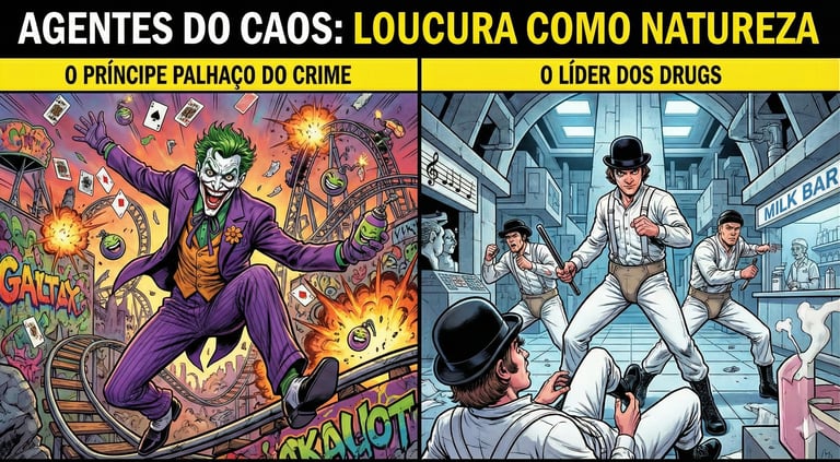A glamourização da violência e a necessidade de dobrar a normalidade social de acordo com a sua vontade são pontos em comum entre o jovem marginal e o maníaco de Gotham. Outro ponto de encontro está na impossibilidade de curá-los. O Coringa já foi internado em Arkham dezenas de vezes e mostrou-se além de qualquer tipo de tratamento. Alex, por sua vez, teve sua loucura "invertida" devido ao tratamento de choque imposto pelo governo britânico, criando uma aversão absoluta à violência. Porém, isso também lhe causa problemas, e mais tarde, ele retoma seus antigos atos, e dessa vez, tem o público ao seu lado, replicando um dom que o Coringa também tem: a capacidade de angariar seguidores, mesmo sendo um criminoso, pois para eles, ambos simbolizam uma possibilidade de libertação de suas próprias correntes.