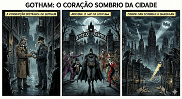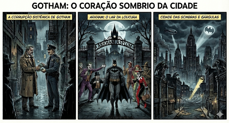 A cidade mais icônica da ficção! Gotham City, criada por Bob Kane e Bill Finger em 1940, baseando-se em Nova York e Chicago, serve perfeitamente como um reflexo perfeito de seu guardião: o Batman.